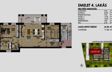 Emelet 4 lakás: 69.35 nm + 11.35 nm loggia