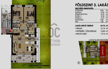 Földszint 3 lakás: 69.75 nm + 12.15 nm terasz + 177 nm privát kert