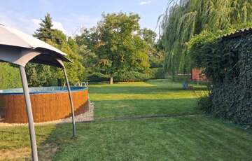 A gondozott, rendezett, nagy méretű, füvesített telek automata öntözőrendszerrel, gyűrűs kútról üzemeltethető. A telken két személyautó számára alkalmas téglaépítésű garázs van, mellette közel ugyanakkora, fapanelekből épített, fedett külső beállóval.