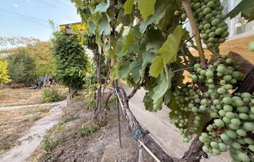 árnyékot adó selyemakác, számos gyümölcsfa, és egy hangulatos szőlőlugas