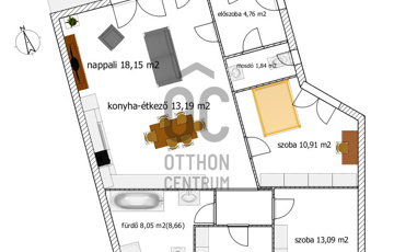 - A fürdőszoba sarokkáddal kerül átadásra, és ezen felül egy önálló wc is helyet kapott a lakásban