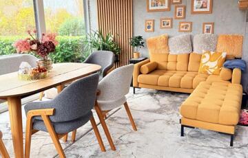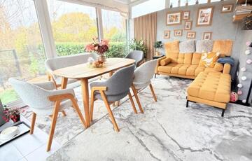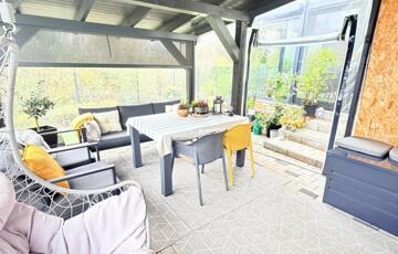 Amint belépsz, az otthon melege és az ízléses enteriőr azonnal magával ragad. A világos, tágas nappali a kerttel és a hangulatos, üvegezett télikerttel nyílik egybe – innen rálátsz a parkosított kertre és a zöldre, ahol gyakran őzek néznek be a kerítésen.