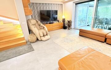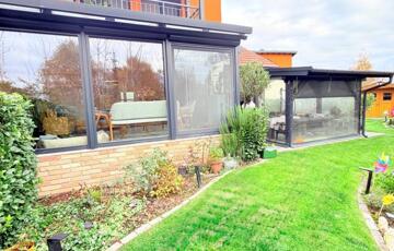 Az utólag kialakított télikert elektromos padlófűtéssel és hűtő-fűtő klímával egész évben tökéletes pihenőhely – akár egy jó kávé mellé reggel, akár egy pohár bor mellé este.