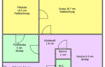 Helyiségei: 1 szoba, 1 félszoba, közlekedő, konyha, kamra, előszoba, fürdőszoba, külön nyíló W.C..