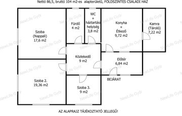 A nettó 86,5 m² (bruttó 100 m²) alapterületű ingatlan nappali + 2 külön nyíló szobával rendelkezik, 2834 m²-es, gondozott telken helyezkedik el.