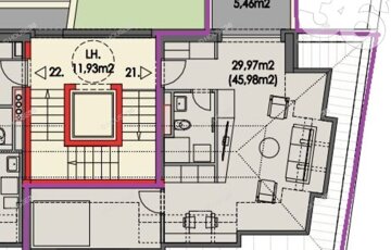Az épület III. emeletén, bruttó 45,98 m2, nettó 29,97 m2 lakóterű, nappali + 1 szobás lakás, 5,46 m2 erkéllyel megvásárolható.