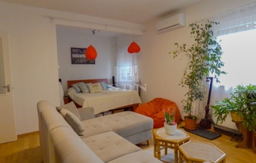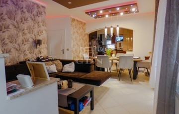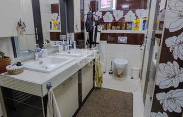 A nagyobbik lakrészen amerikai konyhás (kamrával), étkezős nappali, 4 hálószoba, 2 fürdőszoba, wc, infraszauna, gardrób, nagy terasz lett kialakítva két szinten.