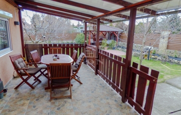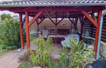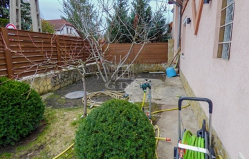 A zárt udvaron 3 autóval meg lehet állni, ebből 2 fedett, az elektromos hálózat felbővített (3*16 A), a kertben egy nagy terasz (20 nm), szaletli (16nm), tároló (20 nm), bográcsozó kapott helyet. Az öntözés fúrt kútról megoldott, a kerítés gondozásmentes.