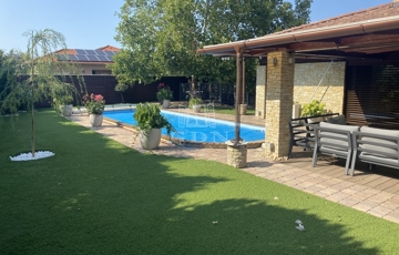 A parkosított kert igazi privát oázis: medence, gyönyörűen karbantartott műfű, rendezett környezet várja az új tulajdonost.