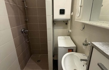 A lakásba belépve egy tágas előszoba fogad minket, innen nyílik a kádas kialakítású fürdőszoba, amely méretét tekintve 3,1 négyzetméteres, itt kapott helyet az új Ariston villanybojler.