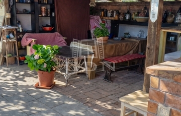 A házhoz kapcsolódik egy hangulatos, rusztikus stílusú, fedett terasz, amely egyedi elképzelések alapján, gondos kivitelezéssel készült.