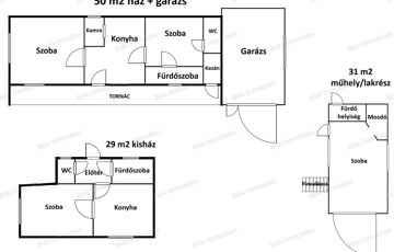Három épület egyetlen területen, és még így is marad bőven művelhető, vagy beépíthető rész. A központi épület 50 m2 életteret rejt magában, kiegészülve egy garázzsal, amely autó tárolásra és műhely célra is alkalmas a maga 24 m2-ével. Vele szemben helyezkedik el a kisebb házikó, amelyben akárcsak a főépületben itt is található konyhahelyiség, fürdőszoba és külön mellékhelyiség. Saroktelekről lévén szó, az épületek felújítást követően külön-külön bérbeadhatók, a telek körbekerített, de több irányból vannak bejáratai, így akár teljesen elkülöníthetőek egymástól a lakrészek.