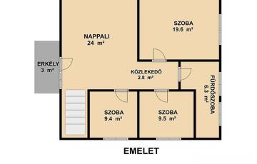 Emelet: 3 szoba, nappali, fürdőszoba + wc, erkély (3 m2)