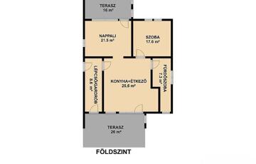 Földszint: 2 szoba, étkezős konyha, 2 terasz (16 m2 és 26 m2), fürdőszoba + wc, közlekedő.