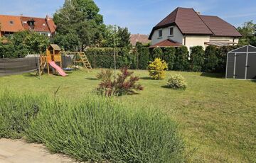 A modern, beépített konyhabútor, a kerti tároló és a játszótér a vételár részét képezi.