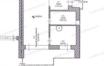 - előtér, nappali-konyha-étkező, egy szoba, fürdőszoba + 14m terasz