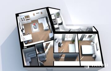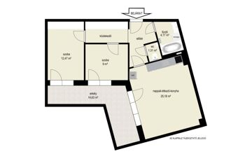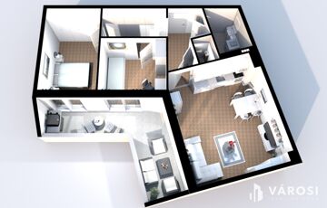 A lakás belső elosztása rendkívül praktikus: nappali-konyha-étkező, 2 hálószoba, kádas fürdőszoba, wc, előszoba, folyosó kialakítású.
