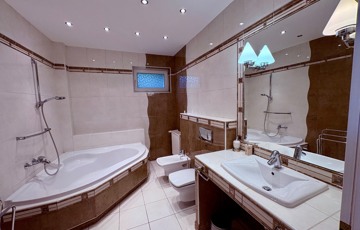 Kifogástalan állapotú, tökéletesen felszerelt konyha-, gardrób- és fürdőszobai beépített szekrények, minden szobában és az étkezőben klíma, ablakokon redőny, motoros külső árnyékoló, riasztórendszer, kerti automata öntözőrendszer, elektromos garázs- és kerti kapu, új kondenzációs Viessmann fali kazán radiátoros hőleadással.