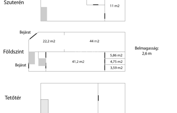 A ház 3 szintből áll, az alaprajzon látható elosztással és egy kis udvarral, ahol ki lett alakítva egy árubepakoló rész ill. akár autóval is beállhatunk.