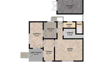 3 szoba, konyha, fürdőszoba + mellékhelyiség, kamra, zárt terasz, műhely.