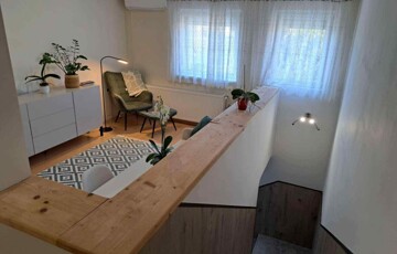 - Felső szint: nappali, 2 szoba, gardrób szoba, zuhanyzó kialakítással fürdő + WC.