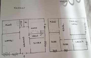 - Alsó szint: nappali, konyha, kamra, 1 szoba, káddal felszerelt fürdőszoba, WC.