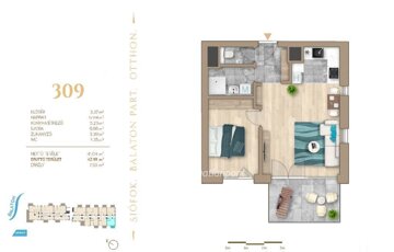 SIÓFOK Ezüstparton 3. emeleti 1 hálószobás erkélyes lakás eladó Siófok a déli part központja, 1 órányi autótávolságra Budapesttől. A parti sétányon elhelyezkedő lakás kiváló lokációval rendelkezik a közelben számtalan kikapcsolódási lehetősséggel még is távol a város zajától. 1 perc séta távolságra az Ezüstpart Yacht kikötő. A 69 lakásos projektben minden lakáshoz erkély tartozik, a fölszinten pedig saját kertek. Az épület fűtési és hűtési energiáját HŐSZIVATTYÚ biztosítja. A lakások fűtése padlófűtés rendszerű, hűtésre és fűtésre is alkalmas FAN-COIL egységekkel kiegészítve. A nyílászárók műanyag profilrendszerből készülnek, többrétegű hőszigetelő üvegezéssel, jó légzárással. A földszinti lakások külső nyílászárói biztonsági fóliával lesznek ellátva. Az épületben korszerű hívólift kerül elhelyezésre. Az ENERGIATAKARÉKOS lakások akár állandó otthonnak vagy nyaralónak is tökéletesek. A projektben fűtött medence kerül kialakításra. A 3.emelet 309-es lakás helyiségei részletesen: - előtér 3,37 m2 - nappali 17,84 m2 - konyha/étkező 5,23 m2 - szoba 9,86 m2 - fürdőszoba 3,39 m2 - wc 1,35 m2 - erkély 7,55 m2 Parkolás mélygarázsban illetve felszíni parkolóban lehetséges. Az OTP Ingatlanpont teljes körű ügyintézéssel áll az eladók és a vevők rendelkezésére! A kínálatunkból választott ingatlan finanszírozásához kedvezményes hitel konstrukciókat kínálunk. Az adásvételi szerződés megkötéséhez igény szerint megbízható ügyvédi közreműködést biztosítunk, és segítséget nyújtunk az adásvételhez kapcsolódó ügyek intézéséhez. Referencia szám: M319686