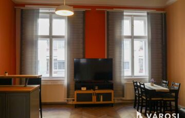Az első emeleti lakás belmagassága 3,82 m, amely elegáns és tágas érzetet kelt. Az amerikai konyhás nappali kényelmesen berendezett, ablakai az utcára néznek. A hálószoba csendes, hangulatos, belső körgangra néző. Külön helyiségben van a zuhanykabinnal ellátott fürdőszoba, a WC és egy tároló. A lakás gépiesített, megtalálható benne hűtőszekrény, sütő, tűzhely, mosogatógép, a megfelelő hőmérsékletről pedig a radiátorok mellett klíma is gondoskodik. Egyedül a mosógép nincsen még beépítve, de kérés esetén ez pótolva lesz.