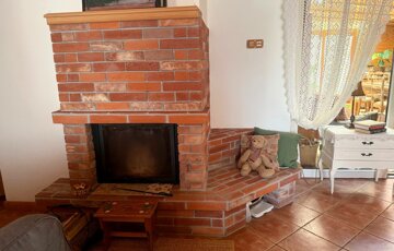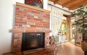 A nappali hangulatát meghatározza a vízteres kandalló, amely a fűtési rendszer része. A látszó fa födém és a meleg burkolatok karakteres, otthonos atmoszférát adnak.