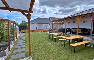 ➡ Kültér: 24,36 m²-es hatalmas UV szűrős polikarbonáttal fedett terasz, 6 m² szigetelt kamra és 4,5 m² szerszámos.