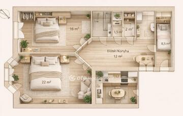 2 külön nyíló szoba + tágas nappali, konyha étkezővel, fürdőszoba külön toalettel.