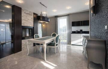 A lakberendező által megálmodott enteriőrben az olasz és spanyol bútorok, az egyedi beépített megoldások, a látványkandalló és az üvegfalak különleges, mégis harmonikus atmoszférát teremtenek. A nappaliból és az étkezőből közvetlen kapcsolat nyílik a térkővel burkolt teraszra és a parkosított, öntözőrendszerrel kiépített, kb. 80 m²-es, intim udvarra – tökéletes helyszín nyugodt, privát kikapcsolódáshoz