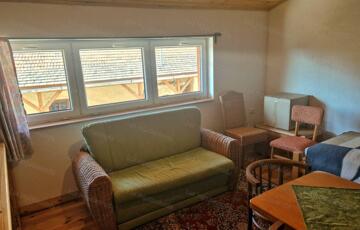 A felső szinten egy világos, tágas szoba kapott helyet, amely kellemes életteret biztosít pihenéshez vagy vendégfogadáshoz.</p>