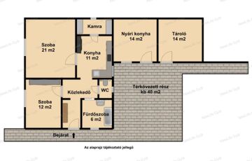 A jelenleg nettó 62 m2-es ház mellett egy nyári konyha csatlakozik a főépülethez, ahol víz, villany és gáz is bevezetésre került (14 m2), illetve mellette egy tároló, szintén 14 m2. Ezek modernizálásra szorulnak.