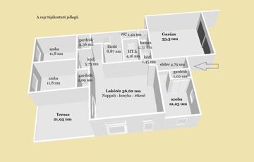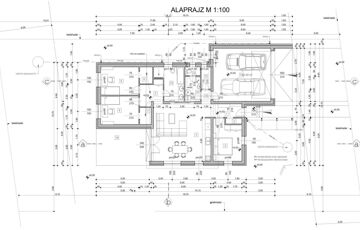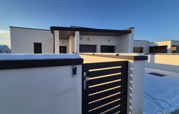 106,69 nm lakótér-nappali + 3 szoba, + 33,3 nm-es fűtött, dupla garázs, terasz + 21,93 nm. Telek: 654 nm.