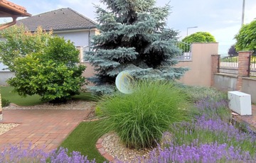 Ha nem lenne elég a dupla garázs, akkor a ház előtti térkővel kirakott nagy méretű gépkocsi beállón további 5 db autó is elfér.