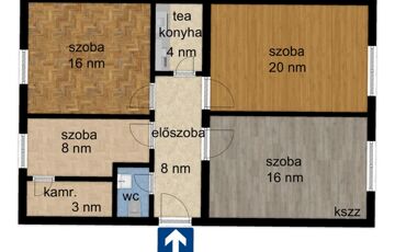 - 4 szoba, előszoba, teakonyha, kamra, WC.