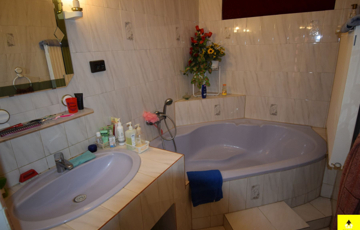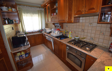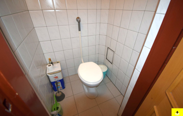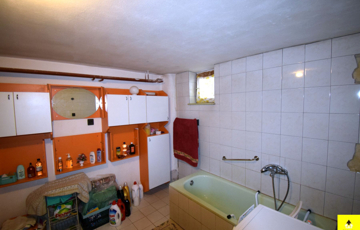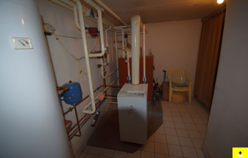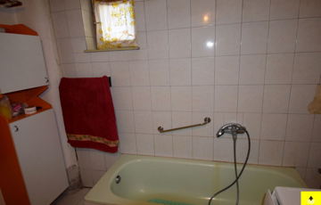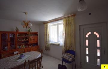 •A földszinti részén (ami inkább magasföldszint) található egy tágas konyha étkezővel, 3 szoba, egy közlekedő, egy kamra egy fürdőszoba és egy wc, valamint a bejáratnál egy félig fedett terasz.
