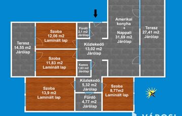 A lakás 1 db amerikai konyhás nappalival, 4 db hálószobával, 2 db fürdőszobával Wc-vel, közlekedővel, előtéttel, dupla terasszal rendelkezik.