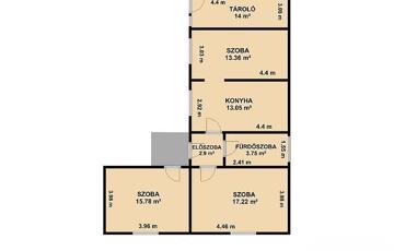 3 szoba, konyha, fürdőszoba + wc, 14 nm-es tároló és 30 nm-es pince.