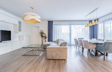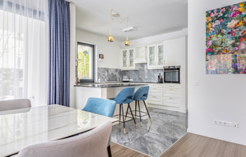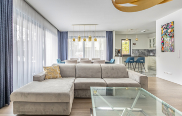 Elrendezése ideális család számára: a közösségi térben tágas (44 nm-es), nappali–étkező, a részben szeparált, világos, ablakos, étkező pulttal épített konyhával, gránit munkalappal, klasszikus fehér frontokkal és teljes körű gépesítéssel, kényelmesen használható toronyba épített sütővel.