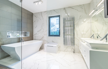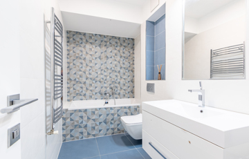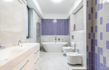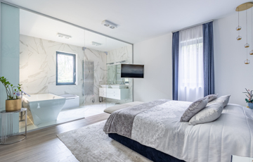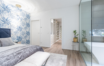 Itt kapott helyet egy nagyméretű hálószoba saját fürdőszobával, dupla mosdóval és szabadon álló káddal.