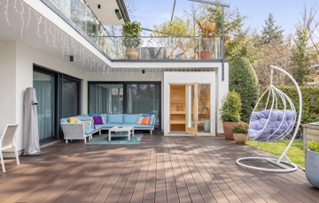 A nappaliból közvetlen kijárat nyílik a részben fedett, 48 nm-es teraszra, amely egybefügg a 79 nm burkolt kertfelülettel, így összesen 127 nm teraszként használható élettér áll rendelkezésre, továbbá 184 nm kizárólagos használatú saját kertrész is tartozik az ingatlanhoz.