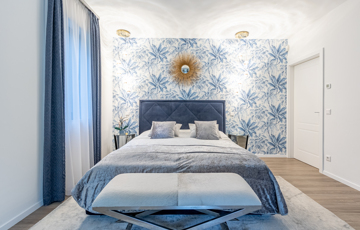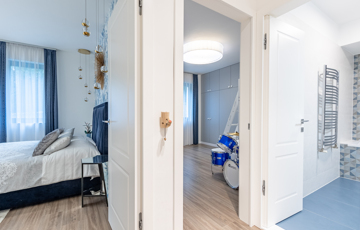 A közlekedőből nyílik további egy hálószoba, és egy kádas fürdőszoba, valamint a szülői apartman - ami egy egyedi megjelenésű -, üvegfallal leválasztott látványfürdővel, design térkáddal, dupla mosdóval, illetve járható gardróbbal is rendelkezik.