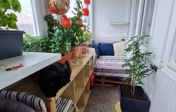 Hangulatos loggia, amely tökéletes pihenősarok – jelenleg tavaszi–nyári–őszi chill zónaként funkcionál, raklapággyal berendezve.