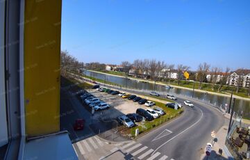 A nappali és konyha ablakból csodás kilátás nyílik a Mosoni-Dunára, ezen túl pedig üzletek, a belvárosi forgatag, Egyetem is szinte az ablakból látszik.