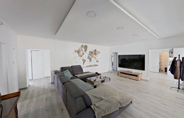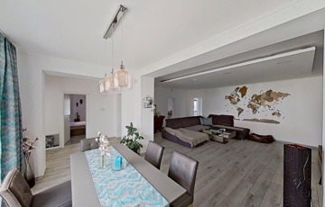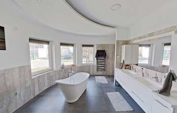 A ház elosztása jól átgondolt, egy nagyobb család számára is komfortos. A központban természetesen a hatalmas nappali/étkező van, de a hálószobák mind külön nyílnak, és több fürdőszoba is rendelkezésre áll a ház távolabbi pontjain.