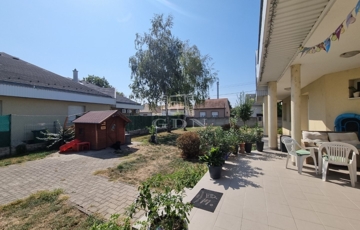 Az utcai kapu elektromosan nyitható, az udvar térkövezett, parkosított. Itt található egy, egy fedett terasz illetve a kertben egy tároló. A kertben kerti kiülő, gyümölcsfa, örökzöld megtalálható. Tehermentes, azonnal költözhető.