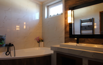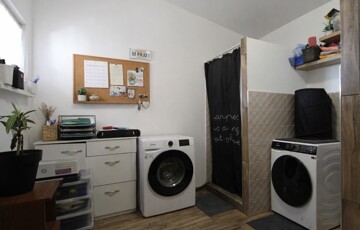 Második bejárata a tetővel ellátott, jól szeparált udvari teraszról nyílik ahol közvetlenül egy mosókonyha került kialakításra. A mosókonyhából pedig egy közlekedőn keresztül azonnal a ház központjába jutunk.
