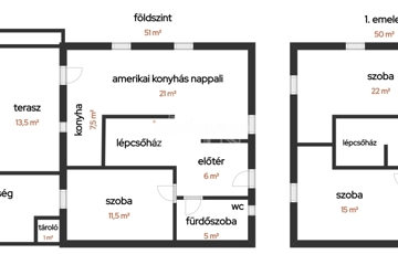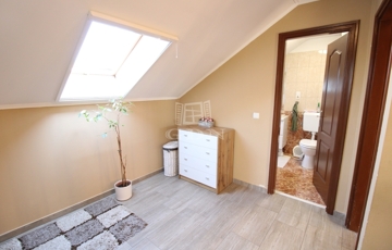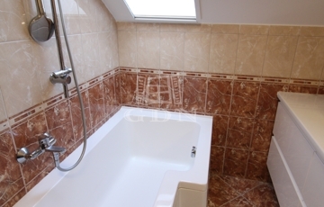 Az emeletre egy kényelmes fokkiosztású stabil lépcsőn juthatunk fel a felső szintre, ahol 8nm-es előtér vagy közösségi tér, kettő egyenként bruttó 22, illetve 15nm nagyságú klimatizált szoba, valamint az 5nm-es kádas fürdőszoba helyezkedik el.